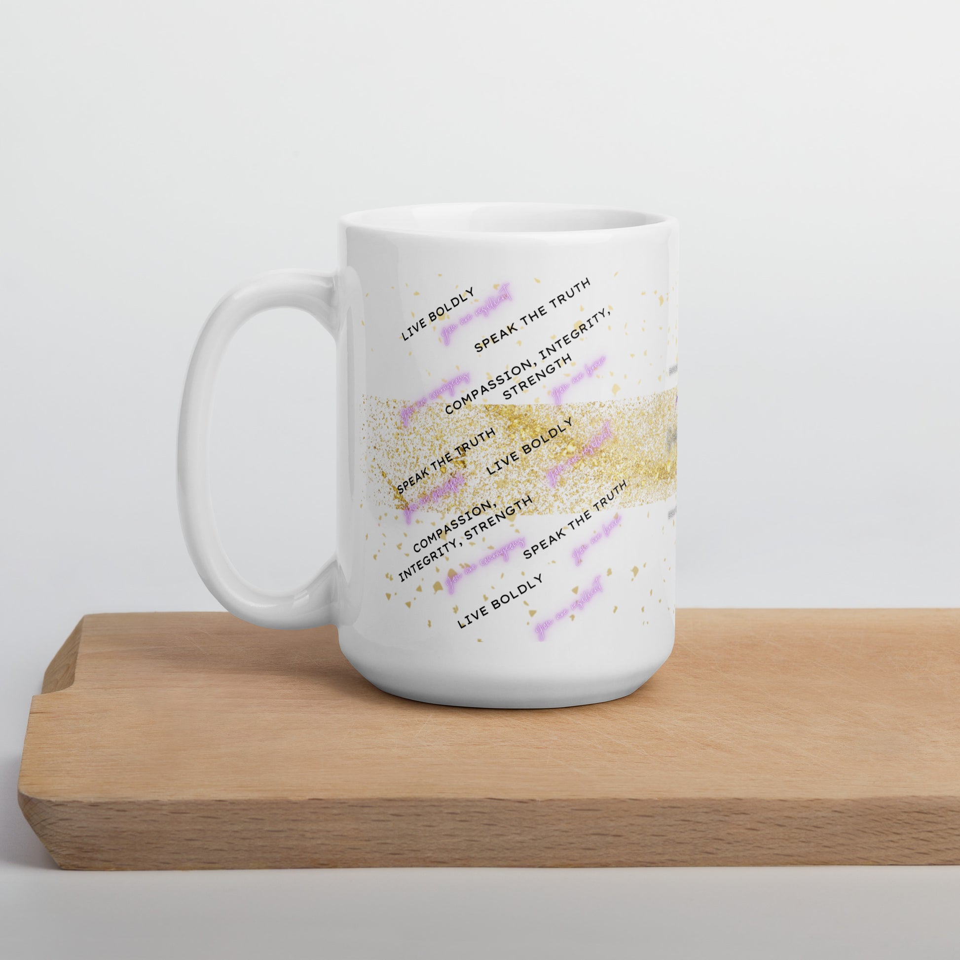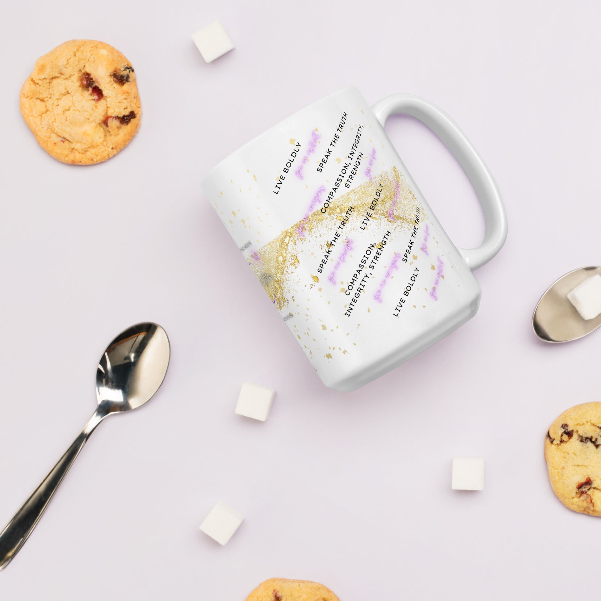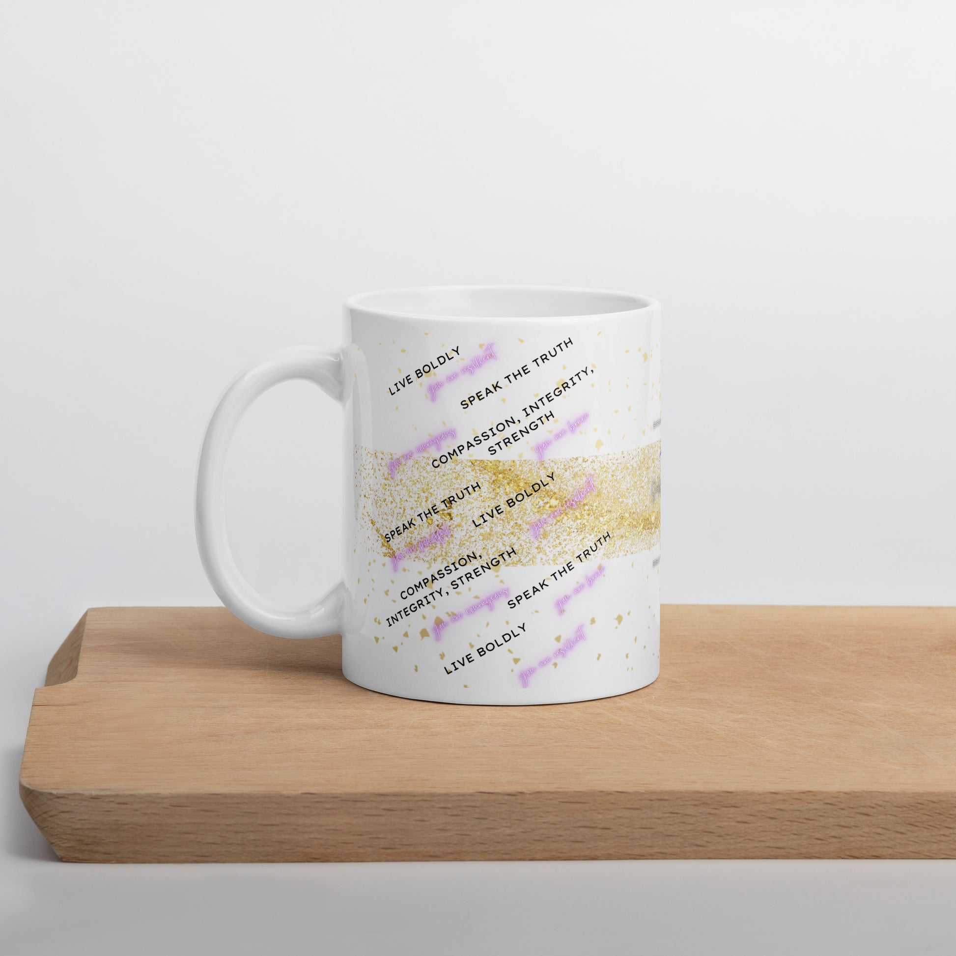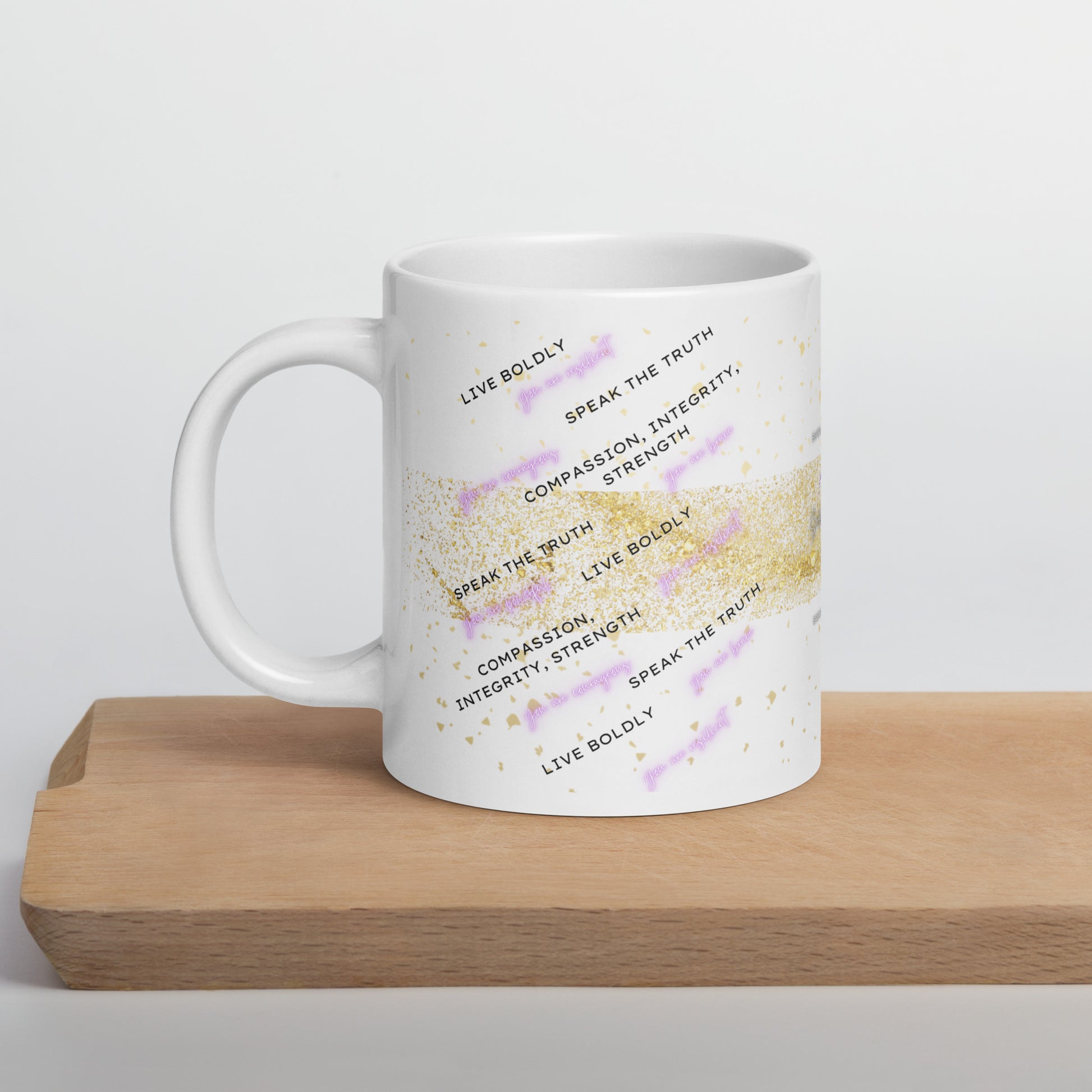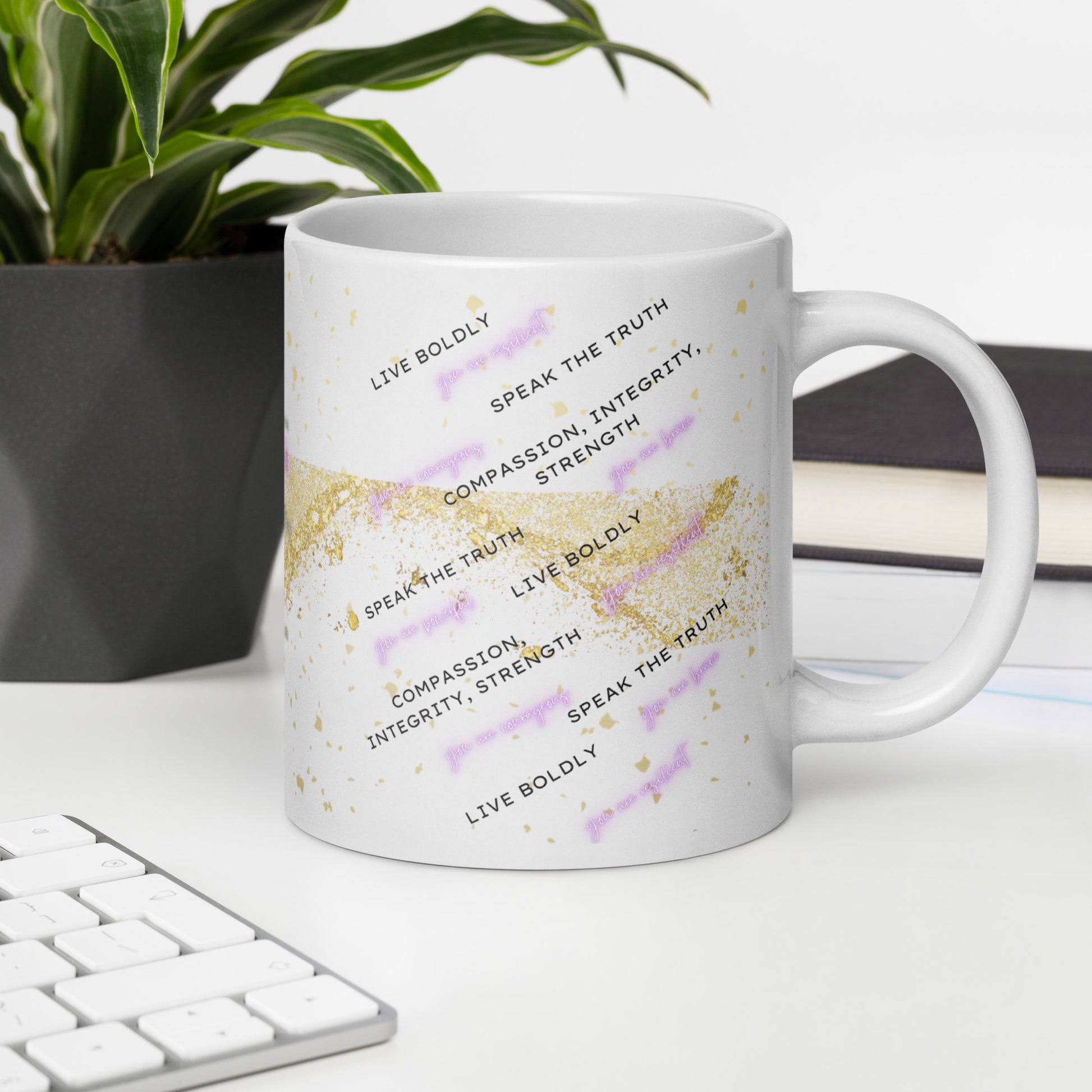 Introducing our Empowerment Elixir Ceramic Mug – a vessel that goes beyond holding your favorite beverages; it cradles a cascade of affirmations to elevate your day. With phrases like "Live Boldly," "Speak Truth," "You Are Courageous," "You Are Powerful," "You Are Resilient," "Compassion," "Integrity," and "Strength," this mug is a celebration of the diverse qualities that make you extraordinary.
