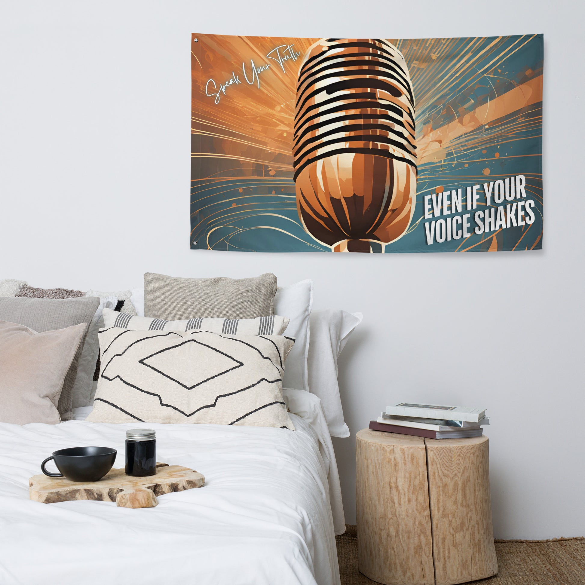 Transform your space with our "Speak Your Truth" All-Over Print Flag, a powerful reminder to stand up for yourself and your beliefs. This flag features a vibrant, abstract background with swirling colors and the quote "Speak your truth, even if your voice shakes" in bold typography. It's not just a decoration; it's a statement of courage and authenticity.