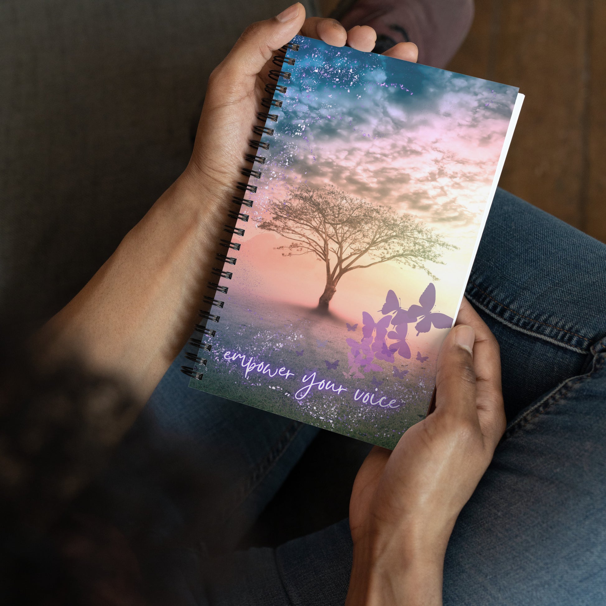 Introducing our "Empower Your Voice" Custom Wire-Bound Notebook — a daily companion designed to inspire, motivate, and empower you every step of the way. The front cover features a captivating image of a tree and butterflies alongside the uplifting phrase "Empower Your Voice," symbolizing growth, transformation, and the beauty of self-expression.