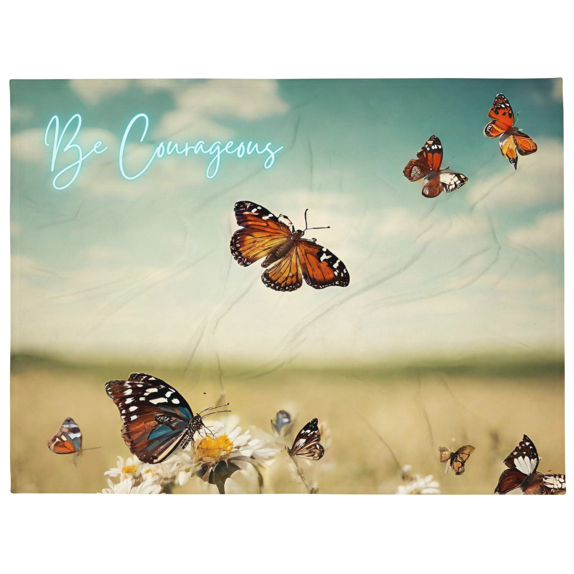Wrap yourself in the warmth of courage with our Fluttering Courage Throw Blanket. Featuring a captivating display of butterflies and the empowering words "Be Courageous," this blanket is more than just a cozy companion; it's a reminder that strength and beauty go hand in hand.